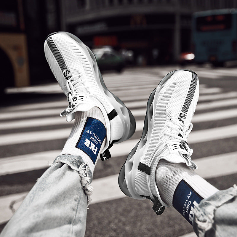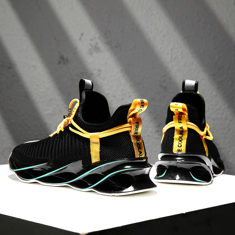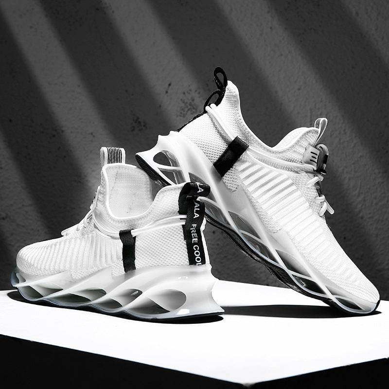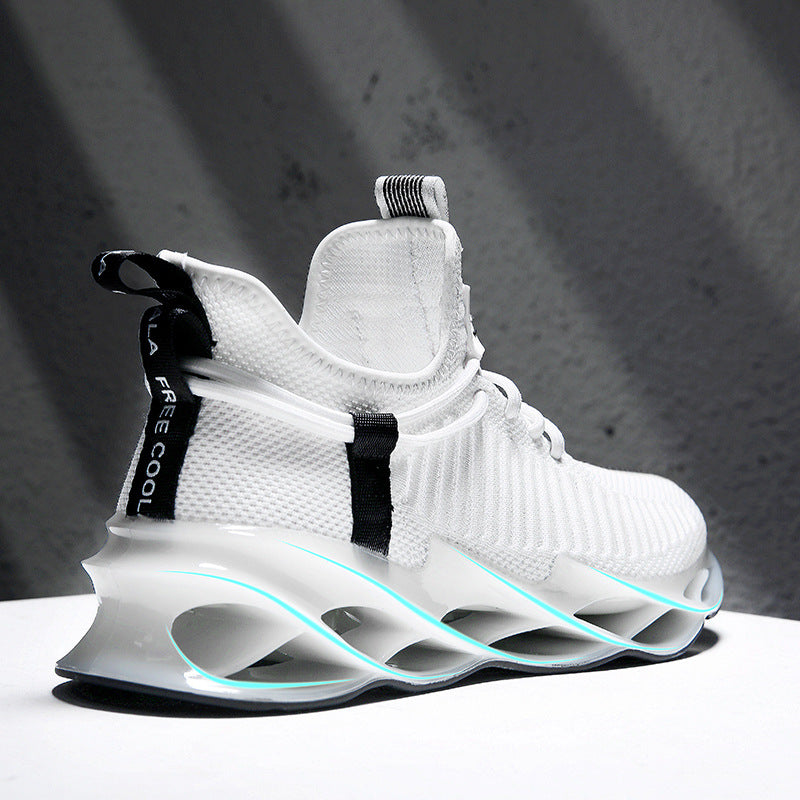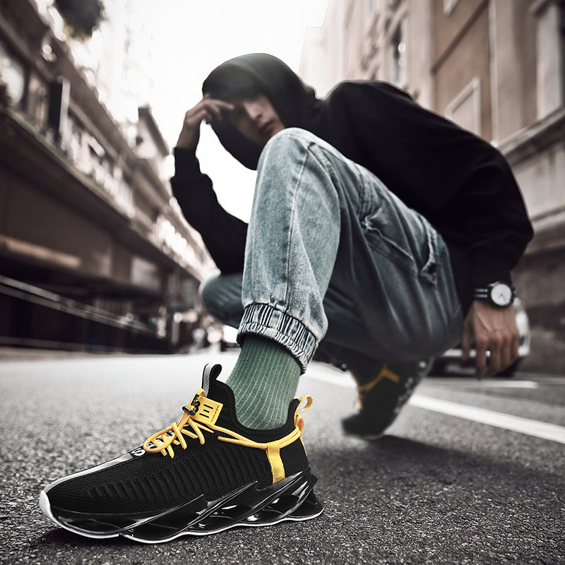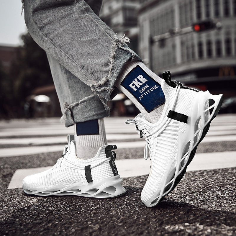 The light blue strips on the sole of the shoe is the effect of using a light to shine on the shoes. we don't have the light blue strips on the sole of the shoe.