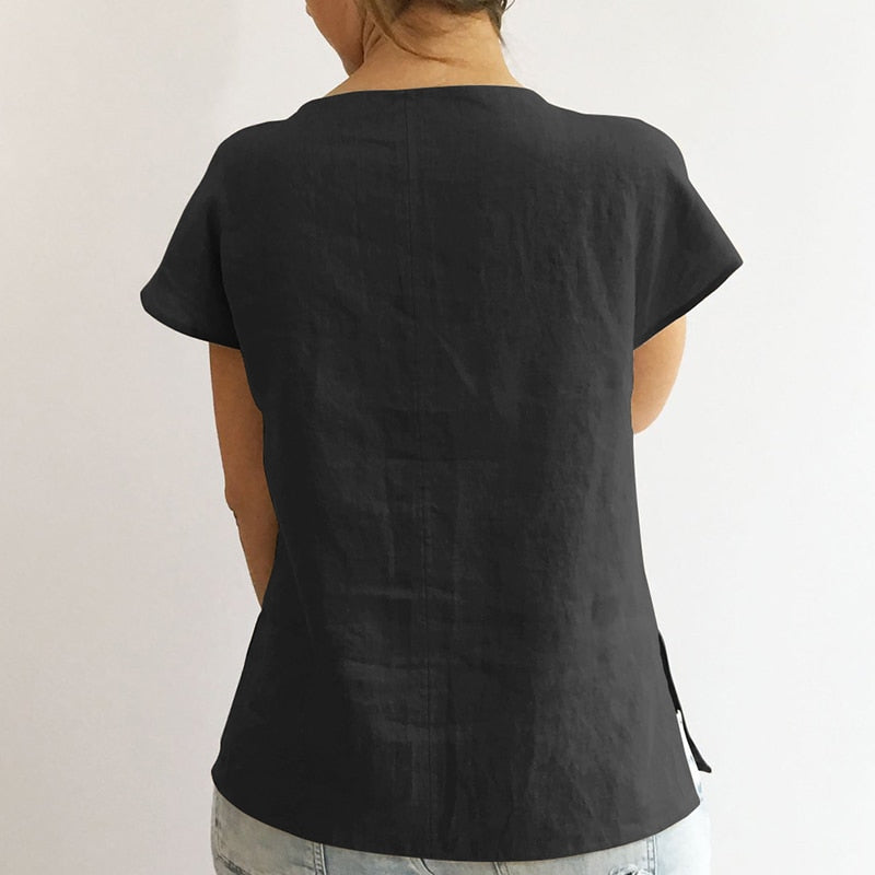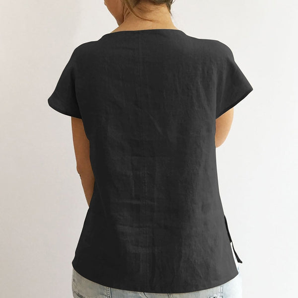 Gender: WomenMaterial: PolyesterClothing Length: REGULARStyle: CasualFabric Type: BroadclothSleeve Length(cm): ShortDecoration: SplicedPattern Type: SolidCollar: O-NeckSleeve Style: REGULARModel Number: Women Blouse