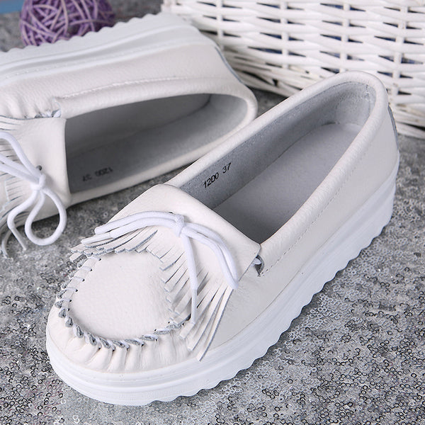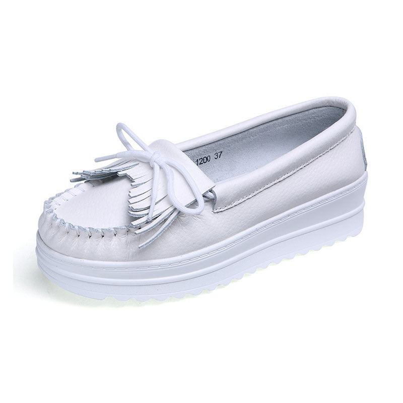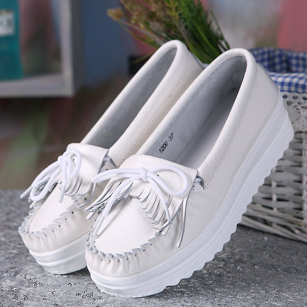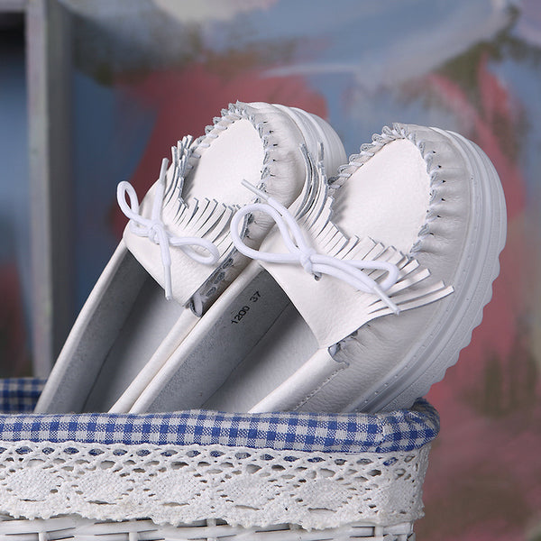 White Genuine Leather Tassel Heightening Platform Shoes – pingchic